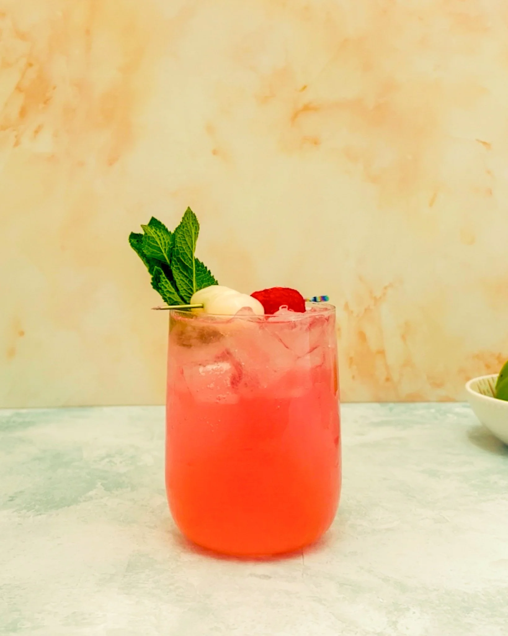 Caleño Light & Zesty, Raspberry Syrup, Lychee, Lime Juice, Rose Lemonade